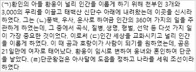 | 20. 다음은 단군신화의 내용을 요약한 것이다. 선민(選民) 사상과 관련된 부분은?